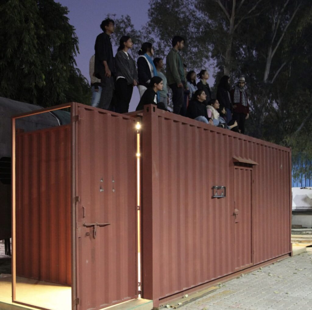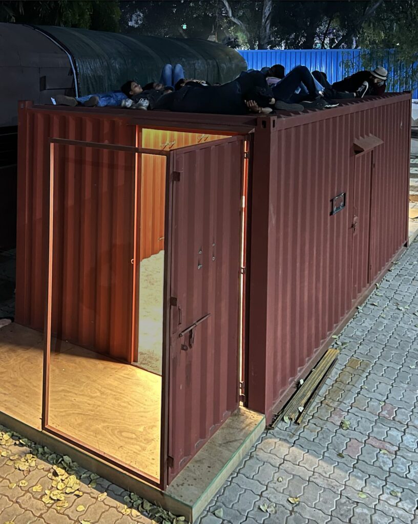 At the India Art Fair, the artist invites visitors into an immersive environment, the central locus of which is a container. Strategically placed within a popular art platform, with all its hustle and bustle, the sacrosanctum of this container is a place of repose. The container has entry and exit points, thereby being made into a passage. The passage becomes a sound chamber through the act of listening. Sound here is used as a device that draws visitors closer and inside. As the visitor passes through the container, they’re invited to have a moment to stay, through the lure of a poem, read to each one, intimately, as voices fill up the space of the container to create a sensorial experience of ‘withness’ and hospitality. The loosely choreographed movement of reciters plays with ideas of vertical and horizontal axis.